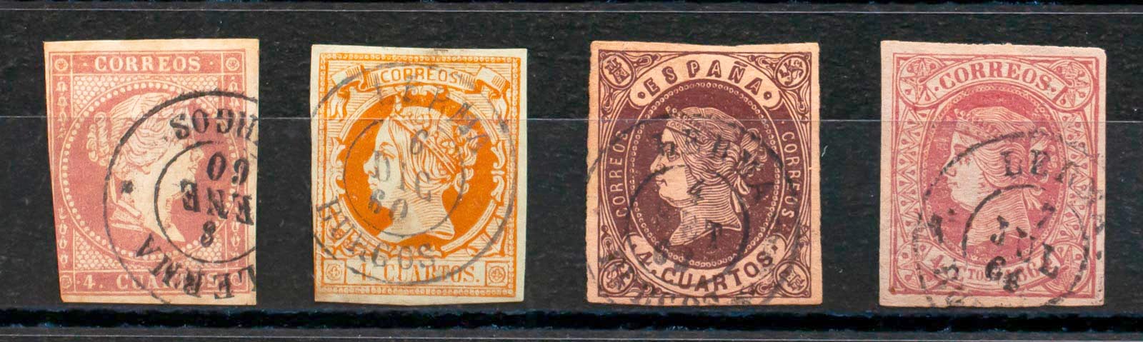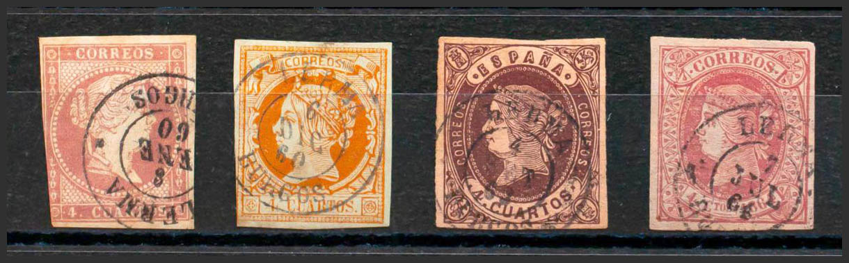 48, 52, 58, 64. (1855ca). Conjunto de cuatro sellos del 4 cuartos rojo, amarillo, castaño y rosa, inutilizados con el matasello LERMA / BURGOS. MAGNIFICO.
