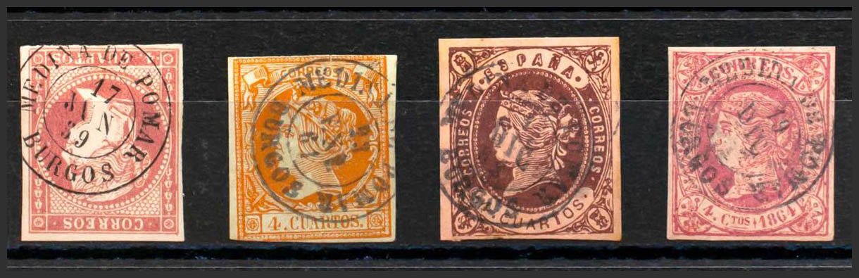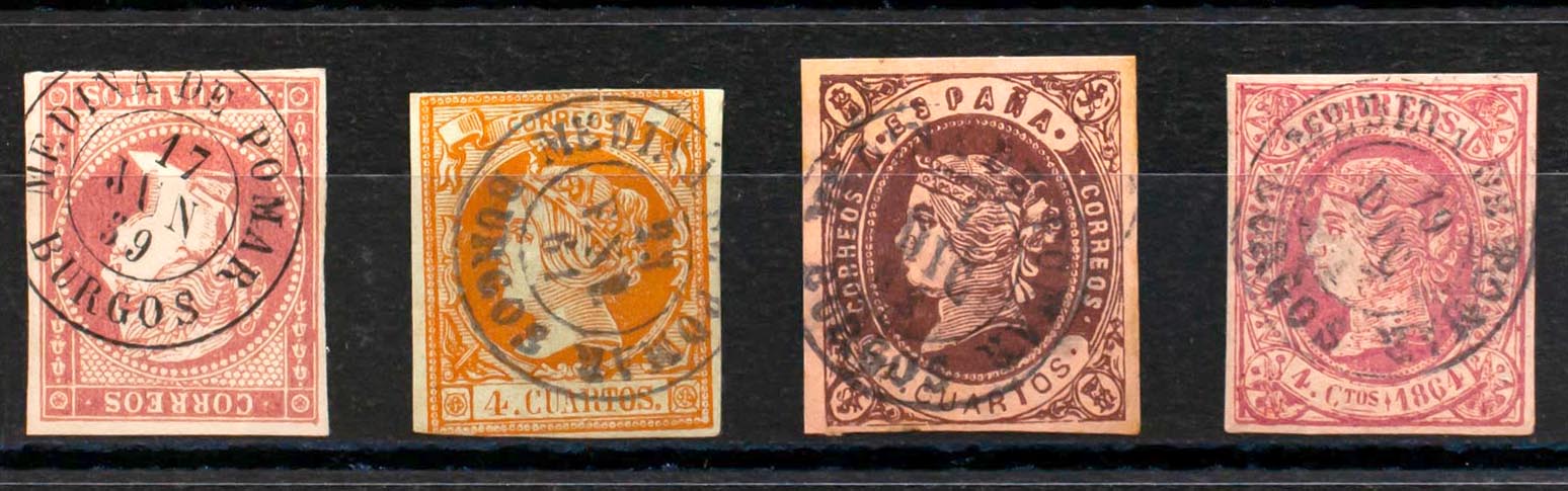 48, 52, 58, 64. (1855ca). Conjunto de cuatro sellos del 4 cuartos rojo, amarillo, castaño y rosa, inutilizados con el matasello MEDINA DE POMAR / BURGOS. MAGNIFICO.