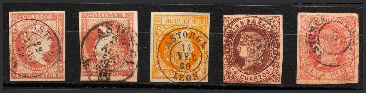 48(2), 52, 58, 64. (1855ca). Conjunto de cinco sellos del 4 cuartos rojo, amarillo, castaño y rosa, inutilizados con el matasello ASTORGA / LEON (incluyendo el Tipo I sobre el 4 cuartos rojo). MAGNIFICO.