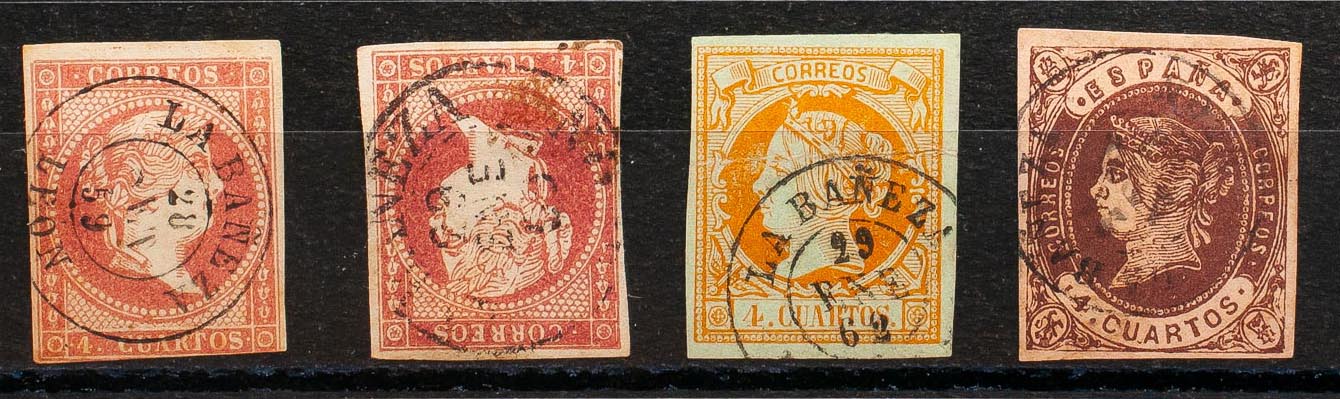 48(2), 52, 58. (1855ca). Conjunto de cuatro sellos del 4 cuartos rojo, amarillo y castaño, inutilizados con el matasello LA BAÑEZA / LEON (incluyendo el Tipo I sobre el 4 cuartos rojo). MAGNIFICO.