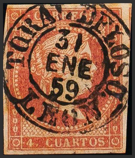 48. 1855. 4 cuartos rojo. Matasello TORAL DE LOS G. / LEON (Tipo I). MAGNIFICO Y RARO.