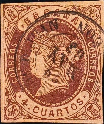 58. 1862. 4 cuartos castaño. Matasello VALENCIA DE D.JUAN / LEON. BONITO Y RARO.