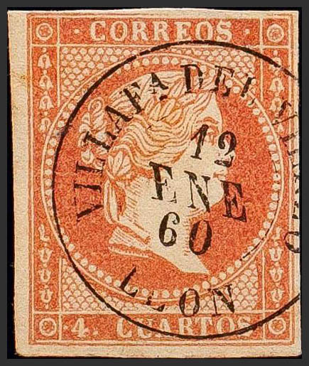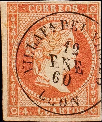 48. 1855. 4 cuartos rojo. Matasello VILLAFª DEL VIERZO / LEON. MAGNIFICO.