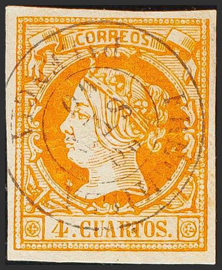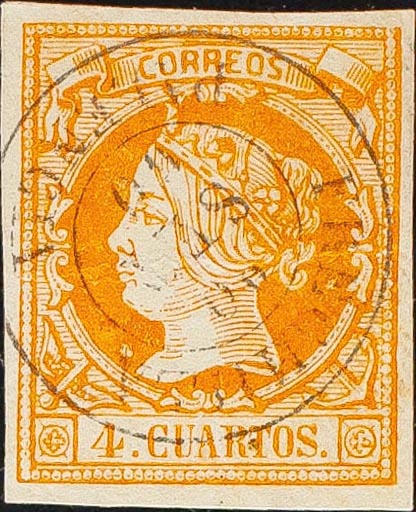 52. 1860. 4 cuartos amarillo. Matasello FRECHILLA / PALENCIA. MAGNIFICO.