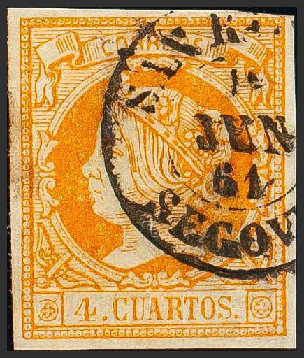 52. 1860. 4 cuartos amarillo. Matasello SAN RAFAEL / SEGOVIA. MAGNIFICO Y RARO.