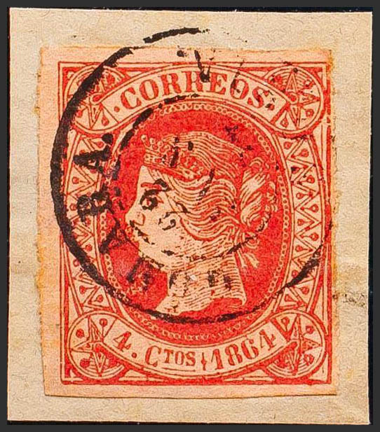 △ 64. 1864. 4 cuartos rosa, sobre fragmento. Matasello GOMARA / SORIA. MAGNIFICO Y RARO.