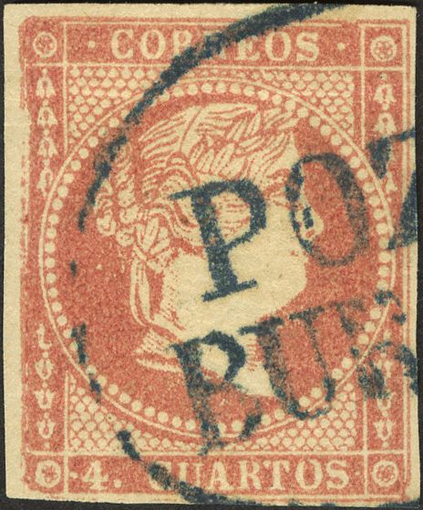 48. 1856. 4 cuartos rojo. Matasello prefilatélico POZAS / BURGOS, en azul. MAGNIFICO Y RARO.