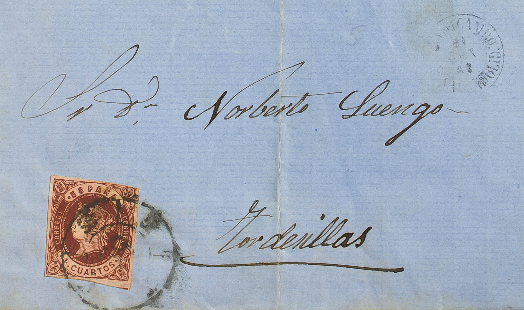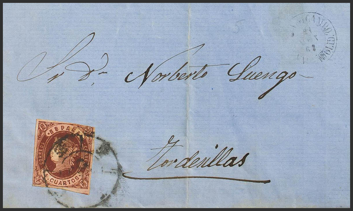 58. 1862. 4 cuartos castaño. MEDINA DEL CAMPO a TORDESILLAS. Matasello R.CARRETA Nº55, de Medina del Campo. MAGNIFICA Y RARA. Edifil 2014: 230 Euros
