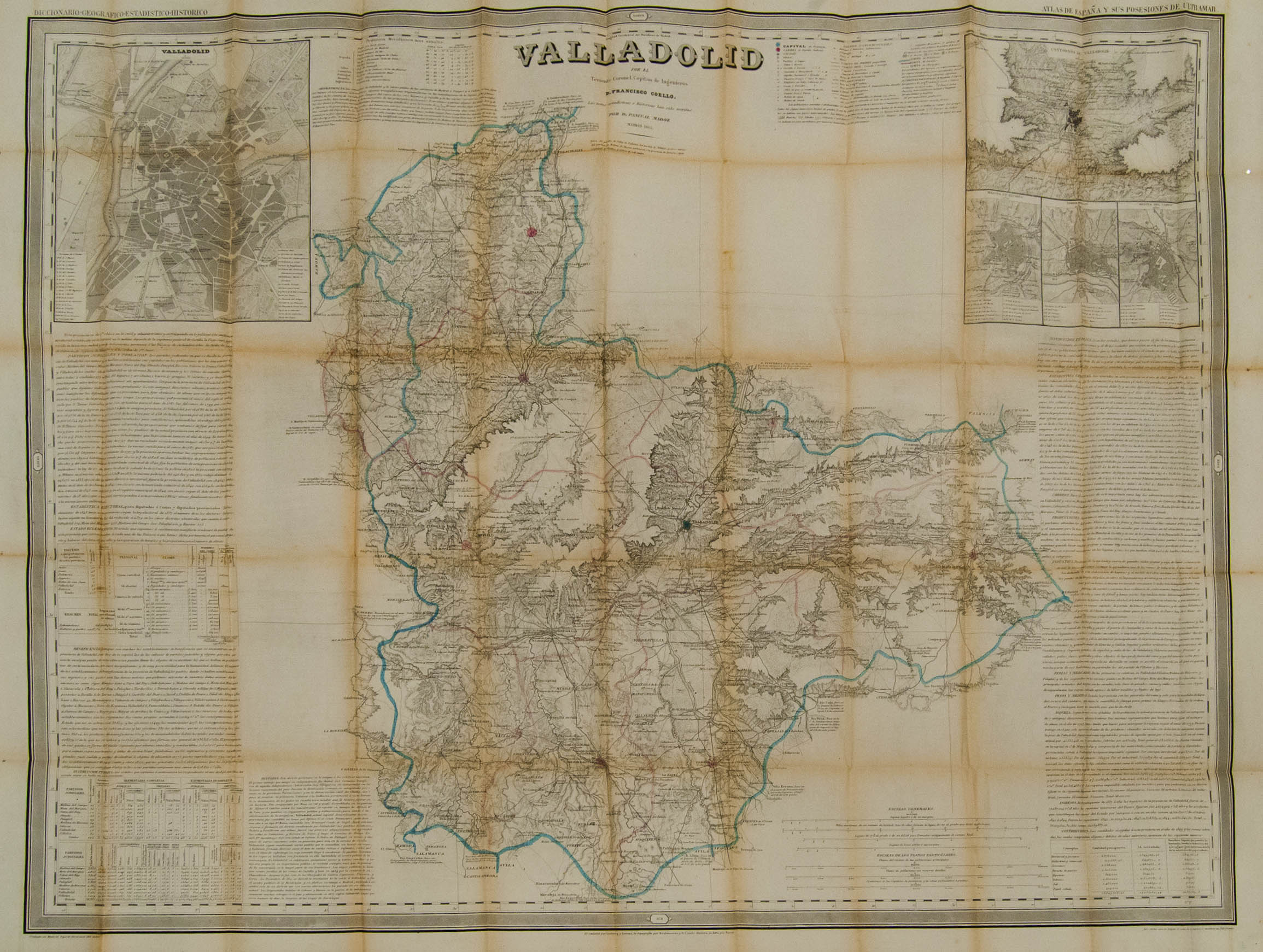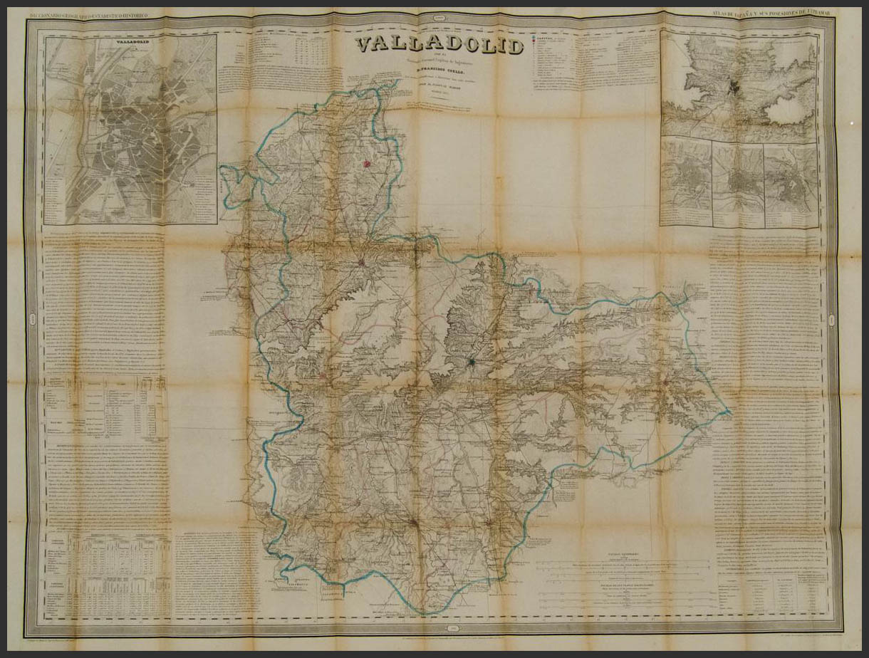 1852. ATLAS DE ESPAÑA Y SUS POSESIONES DE ULTRAMAR, Francisco Coello. Correspondiente a la provincia de VALLADOLID y en la edición de cartoné de 1853 (mapa y carpetilla), se incluyen datos históricos, administrativos, etc y los planos de las mayores ciudades de la provincia en aquel momento. MAGNIFICO E INUSUAL MAPA DEL PERIODO DE ISABEL II, QUE INCLUYE TODAS LAS RUTAS DE POSTAS DE LA EPOCA, IDEAL PARA EL ESTUDIO DE LA HISTORIA POSTAL DEL COLECCIONISTA DE ESTA REGION, ESTA OBRA SIEMPRE HA ESTADO PRESENTE EN LAS GRANDES BIBLIOTECAS FILATELICAS ESPAÑOLAS COMO LAS DE MONGE, ESCALADA, TIZON, GALVEZ. Ex-GRAUS.