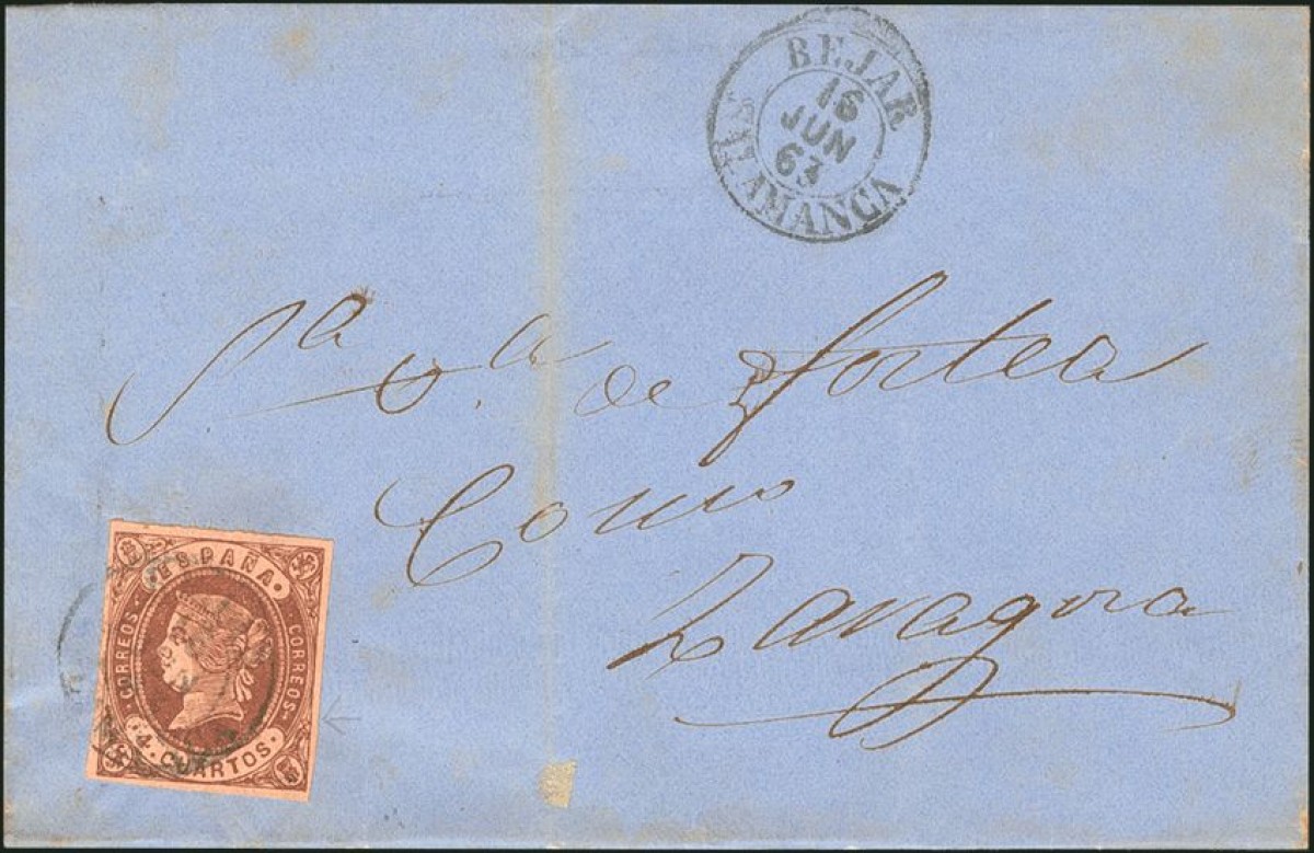 58. 1862. 4 cuartos castaño. BEJAR a ZARAGOZA. Matasello BEJAR / SALAMANCA.