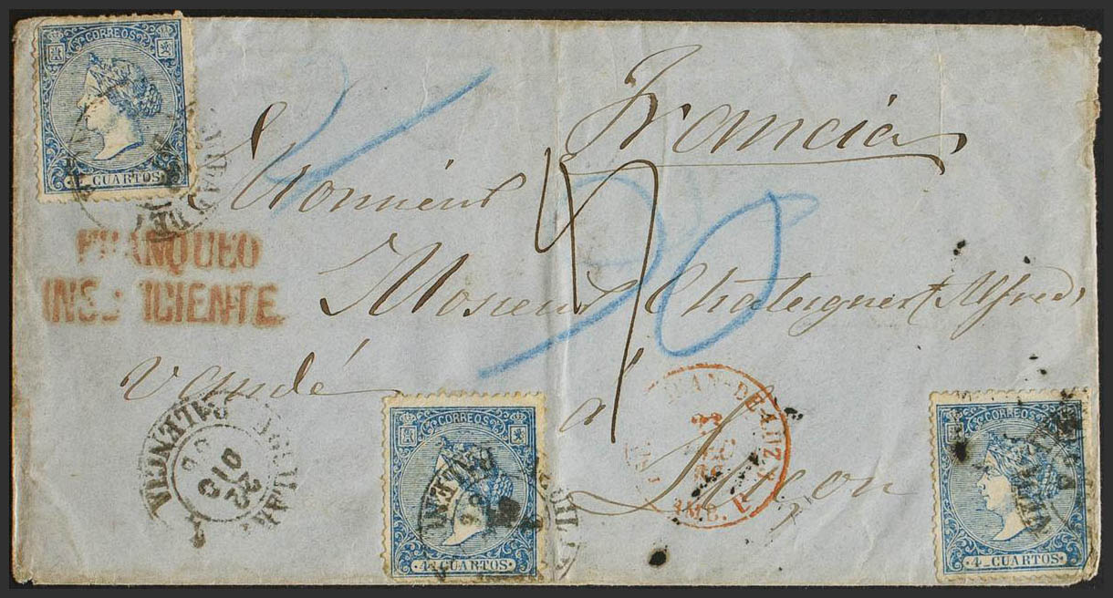 81(3). 1866. 4 cuartos azul, tres sellos. AGUILAR DE CAMPOO a LUZON (FRANCIA). Matasello AGUILAR DE C. / PALENCIA (Tipo I) y en el frente marca FRANQUEO / INSUFICIENTE y porteo manuscrito "4" (décimas). MAGNIFICA E INUSUAL CON LA MARCA DE FRANQUEO INSUFICIENTE POR TRATARSE DE UN DOBLE PORTE, PIEZA DE GRAN BELLEZA.