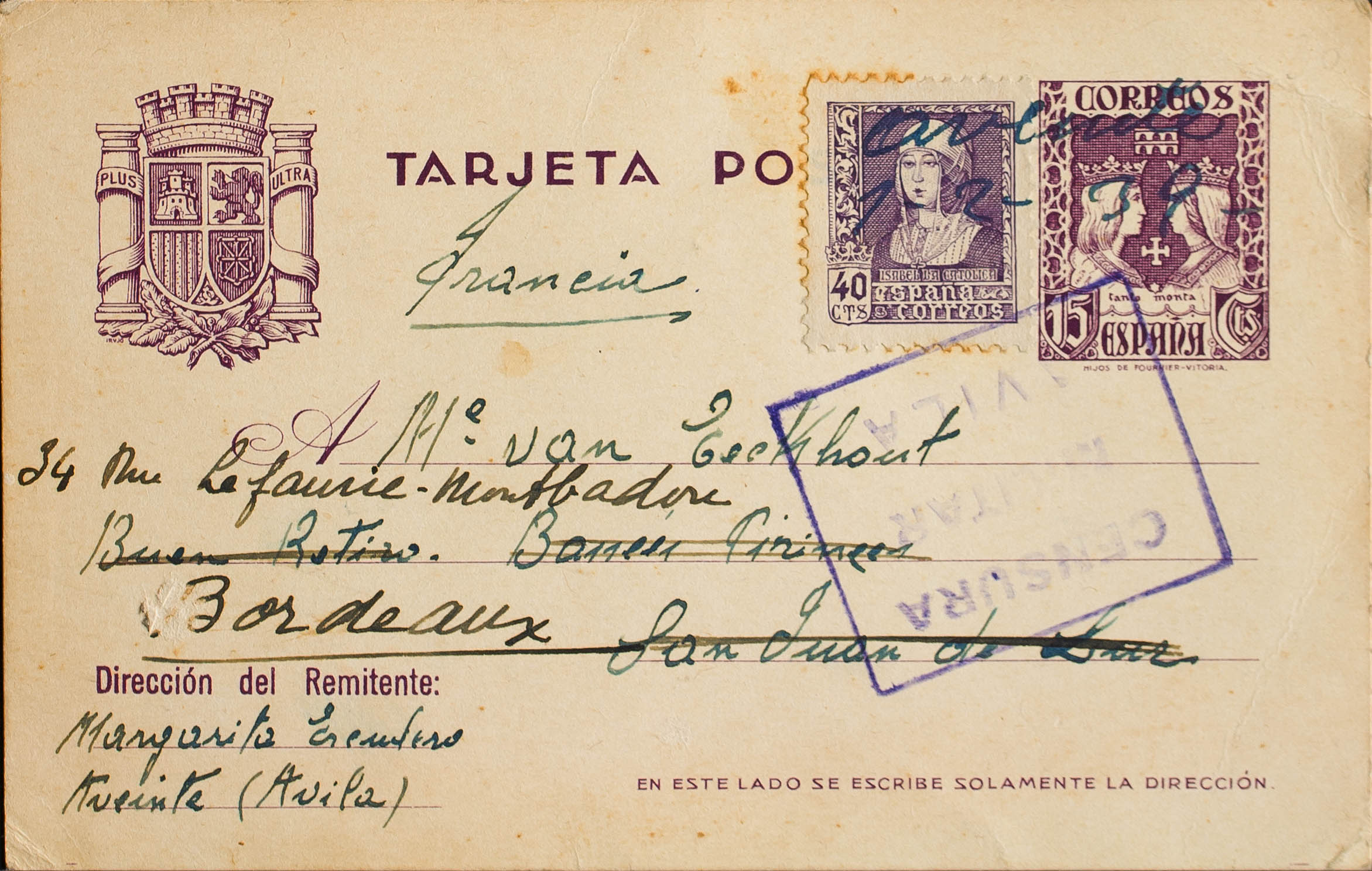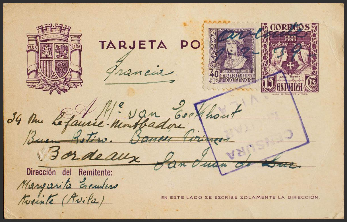 EP81, 858. 1939. 15 cts violeta sobre Tarjeta Entero Postal de AVEINTE (AVILA) a SAN JUAN DE LUZ (FRANCIA), con franqueo complementario de 40 cts violeta, reexpedida a BURDEOS. Inutilización manuscrita "Aveinte, 1-2-39" y marca de censura, al dorso llegada. MAGNIFICA.