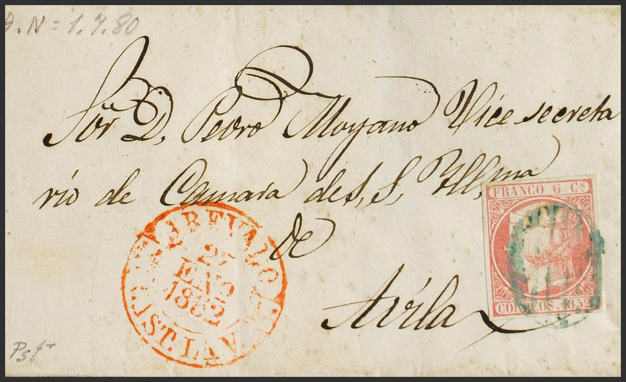 12. 1852. 6 cuartos rosa. AREVALO (AVILA) a AVILA. Matasello PARRILLA, en azul. MAGNIFICA.