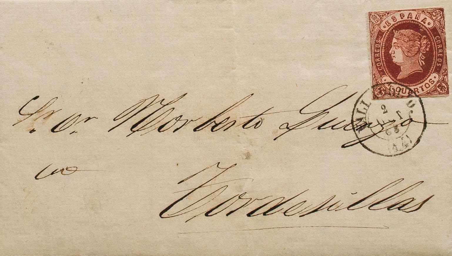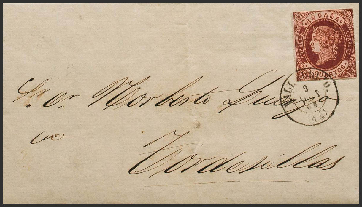 58. 1864. 4 cuartos castaño. VALLADOLID a TORDESILLAS. Matasello VALLADOLID / (14). MAGNIFICA Y RARISIMA.