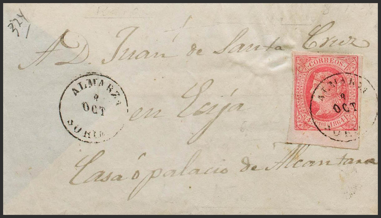 64. 1864. 4 cuartos rojo. ALMARZA a ECIJA. Matasello ALMARZA / SORIA. MAGNIFICA Y RARISIMA.