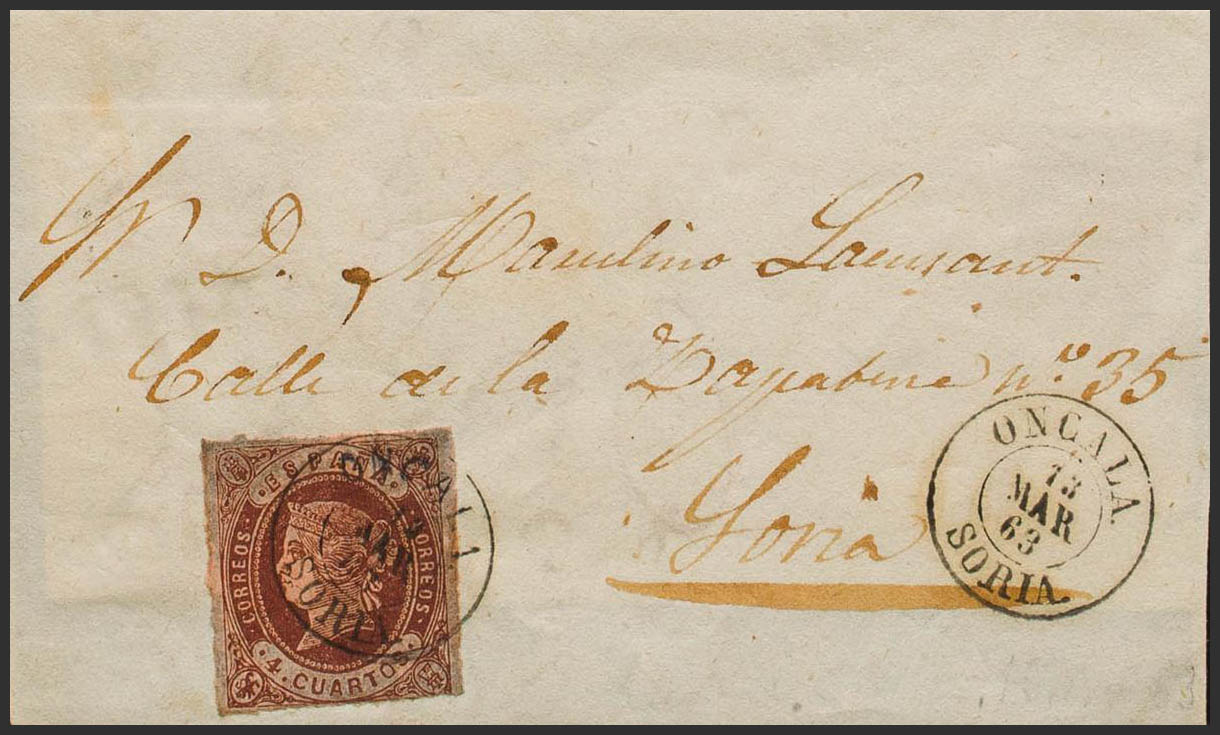 58. 1862. 4 cuartos castaño. ONCALA a SORIA. Matasello ONCALA / SORIA. MAGNIFICA Y RARISIMA.