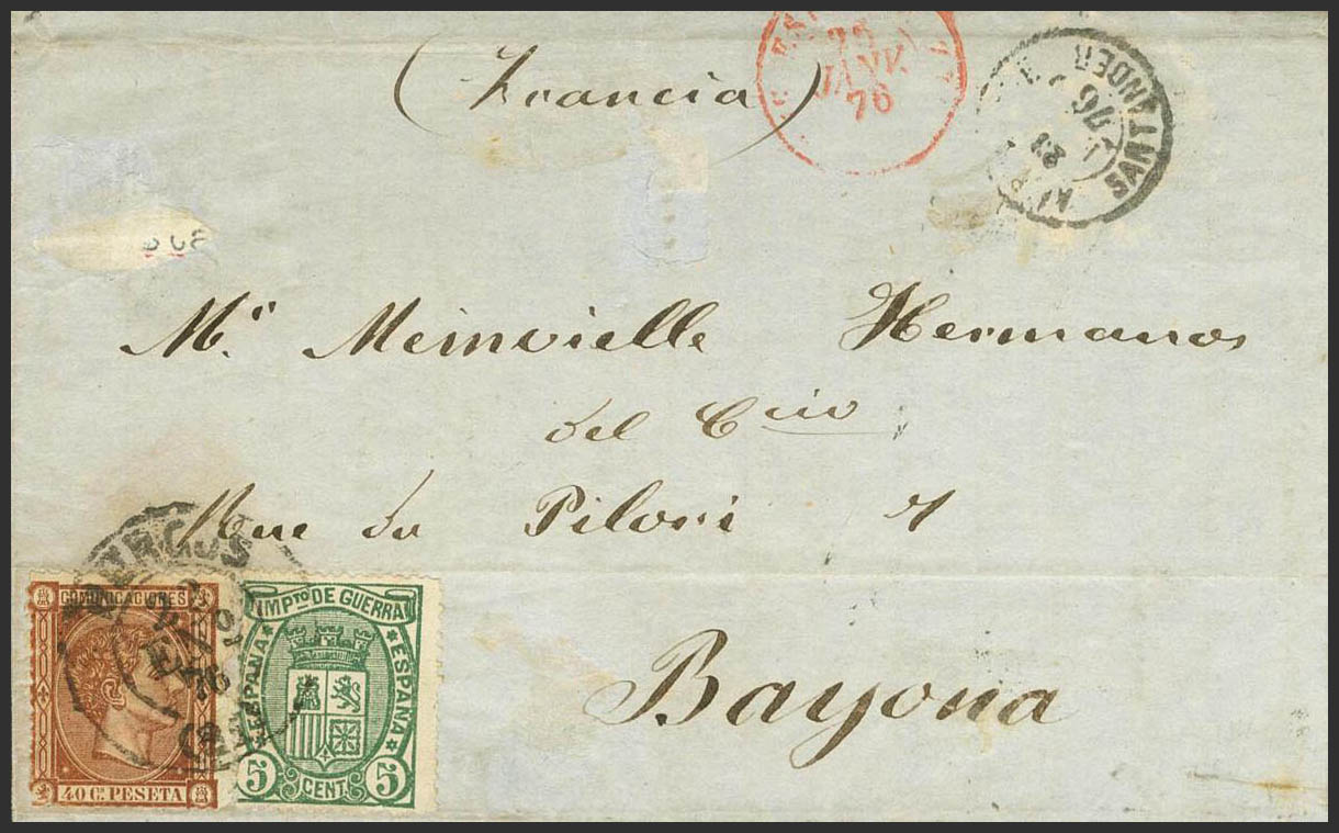 167, 154. 1876. 40 cts castaño y 5 cts verde. BURGOS a BAYONA (FRANCIA). El sello de Impuesto de Guerra era innecesario para las cartas dirigidas al extranjero, además a partir del 1º de Enero de 1876 ya eran aplicables las nuevas tarifas de la UPU, con lo que esta carta deberÃa haber circulado con 25 cts, y no con la antigua tarifa de 40 cts. MAGNIFICA Y EXTRAORDINARIAMENTE RARO FRANQUEO.