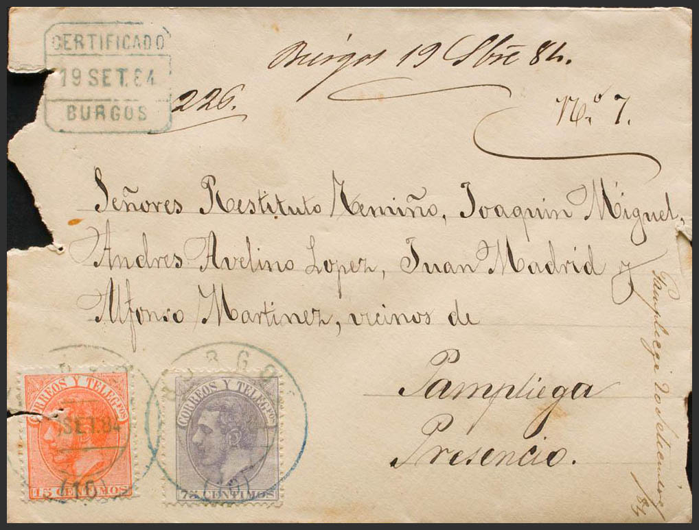 210, 212. 1884. 15 cts naranja y 75 cts violeta. Certificado de BURGOS a PRESENCIO (BURGOS) (erosiones provocadas por el archivo en el lado izquierdo, afectando a un sello sin importancia). Matasello BURGOS / (10), en azul y toma de razón en el frente, al dorso "recibÃ" del destinatario como era preceptivo. MAGNIFICA Y RARA.