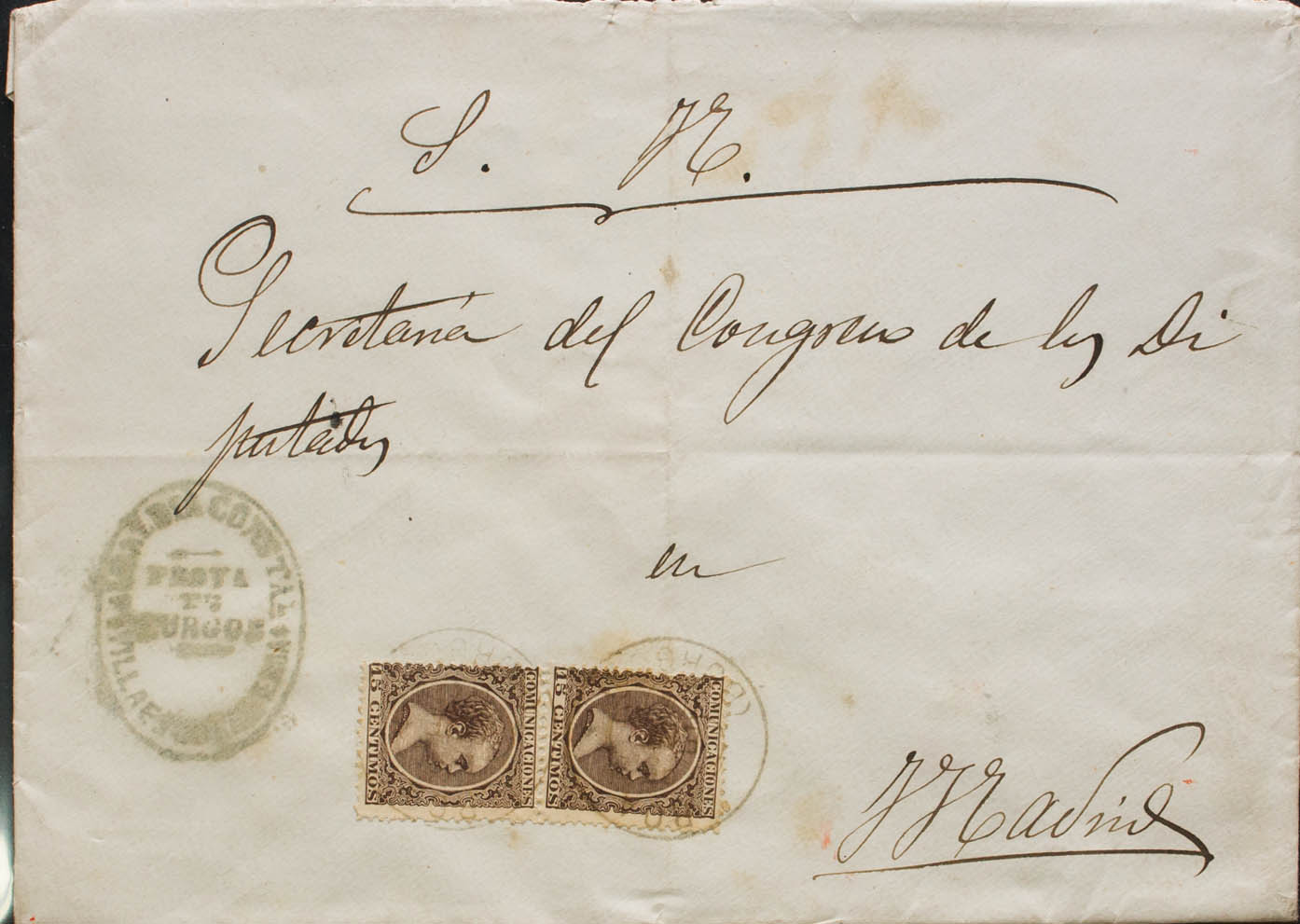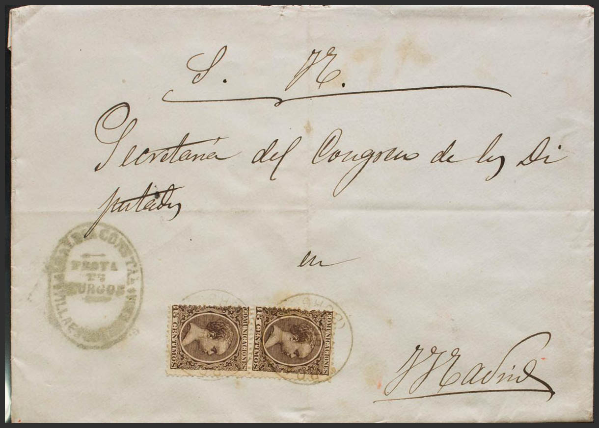 219(2). 1895. 15 cts castaño, dos sellos. VILLAESCUSA DE ROA (BURGOS) a MADRID. Matasello ROA / (BURGOS). MAGNIFICA Y MUY ESPECTACULAR.