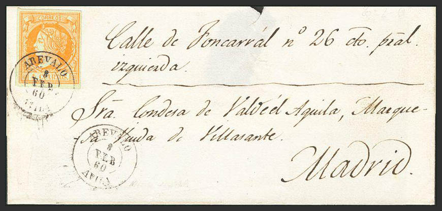 52. 1860. 1860. 4 cuartos amarillo. AREVALO a MADRID. Matasello AREVALO / AVILA.