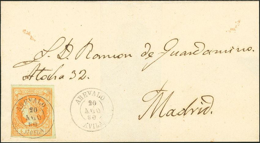 52. 1860. 4 cuartos amarillo. AREVALO a MADRID. Matasello AREVALO / MADRID. MAGNIFICA.