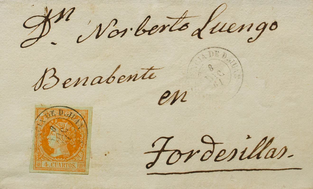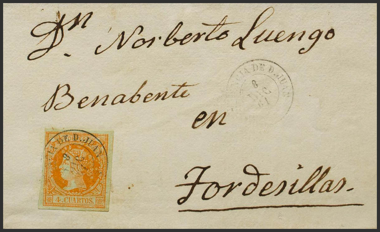 52. 1861. 4 cuartos naranja. VALENCIA DE DON JUAN a TORDESILLAS. Matasello VALENCIA DE D.JUAN / LEON. MAGNIFICA Y MUY RARA.