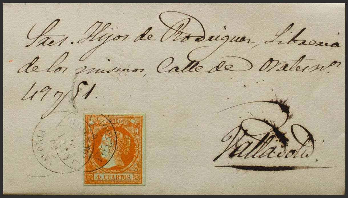 52. 1860. 4 cuartos naranja. VALORIA a VALLADOLID. Matasello VALORIA / VALLADOLID. MAGNIFICA Y EXTREMADAMENTE RARA.