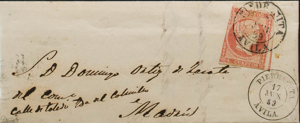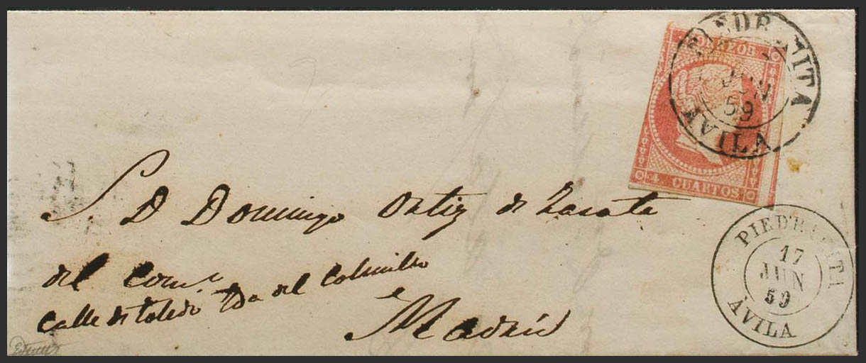 48. 1859. 4 cuartos rojo. PIEDRAHITA a MADRID. Matasello PIEDRAHITA / AVILA (Tipo I). MAGNIFICA Y RARA.