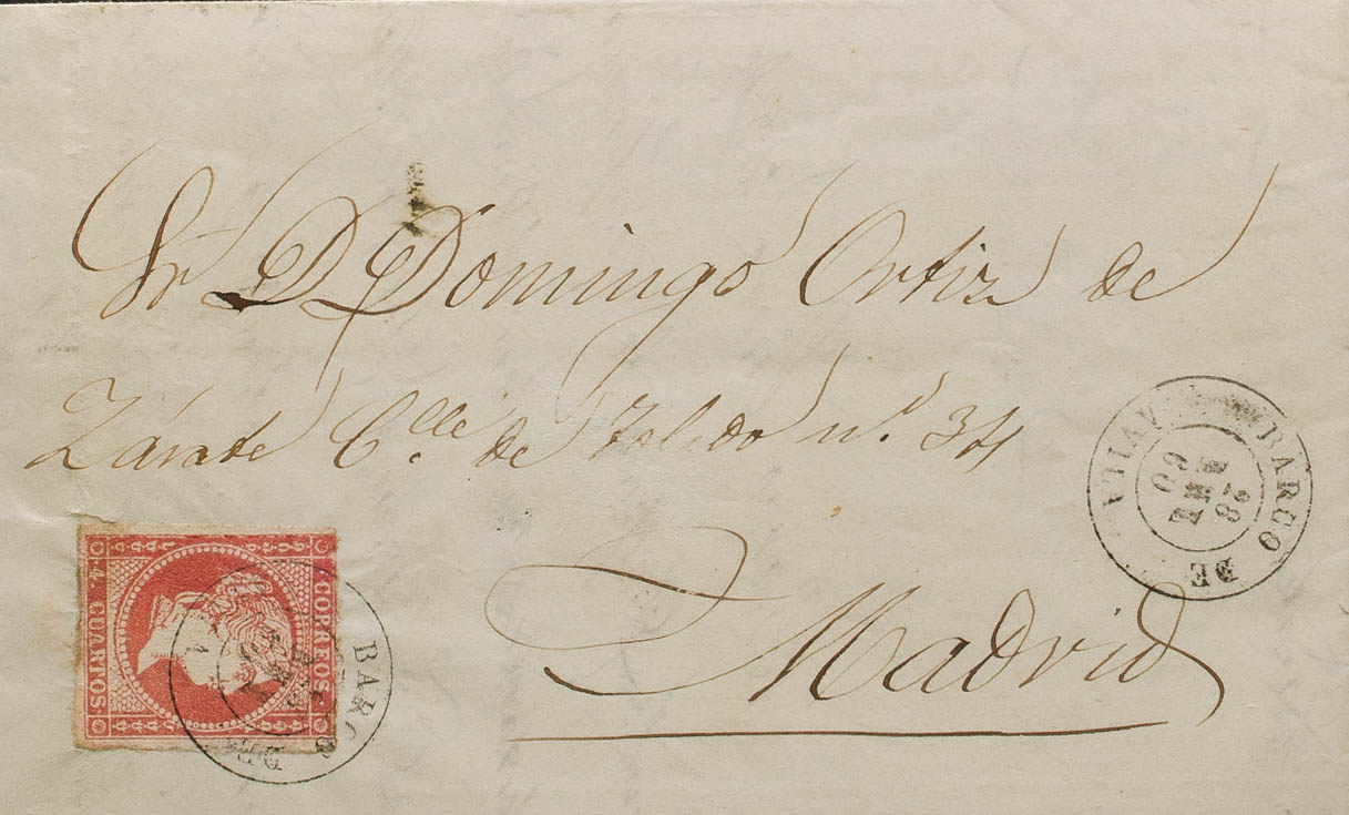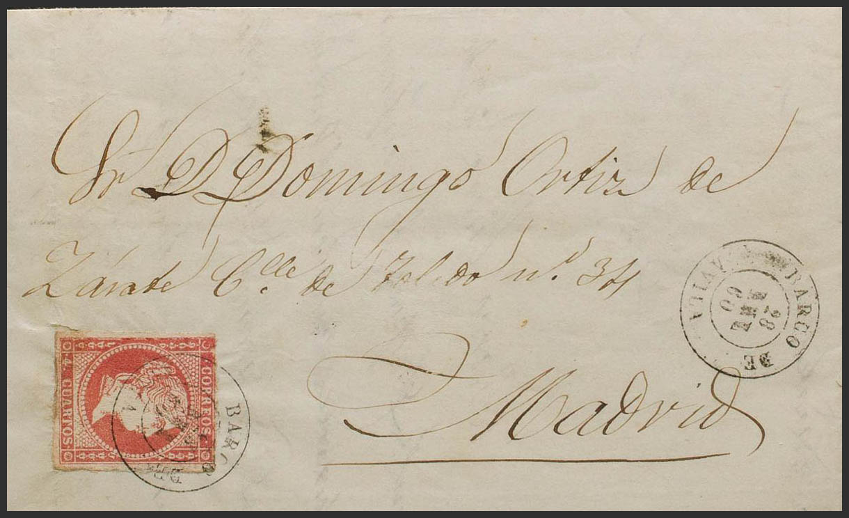 48. 1860. 4 cuartos rojo. BARCO DE AVILA a MADRID. Matasello BARCO DE / AVILA. MAGNIFICA Y RARA.