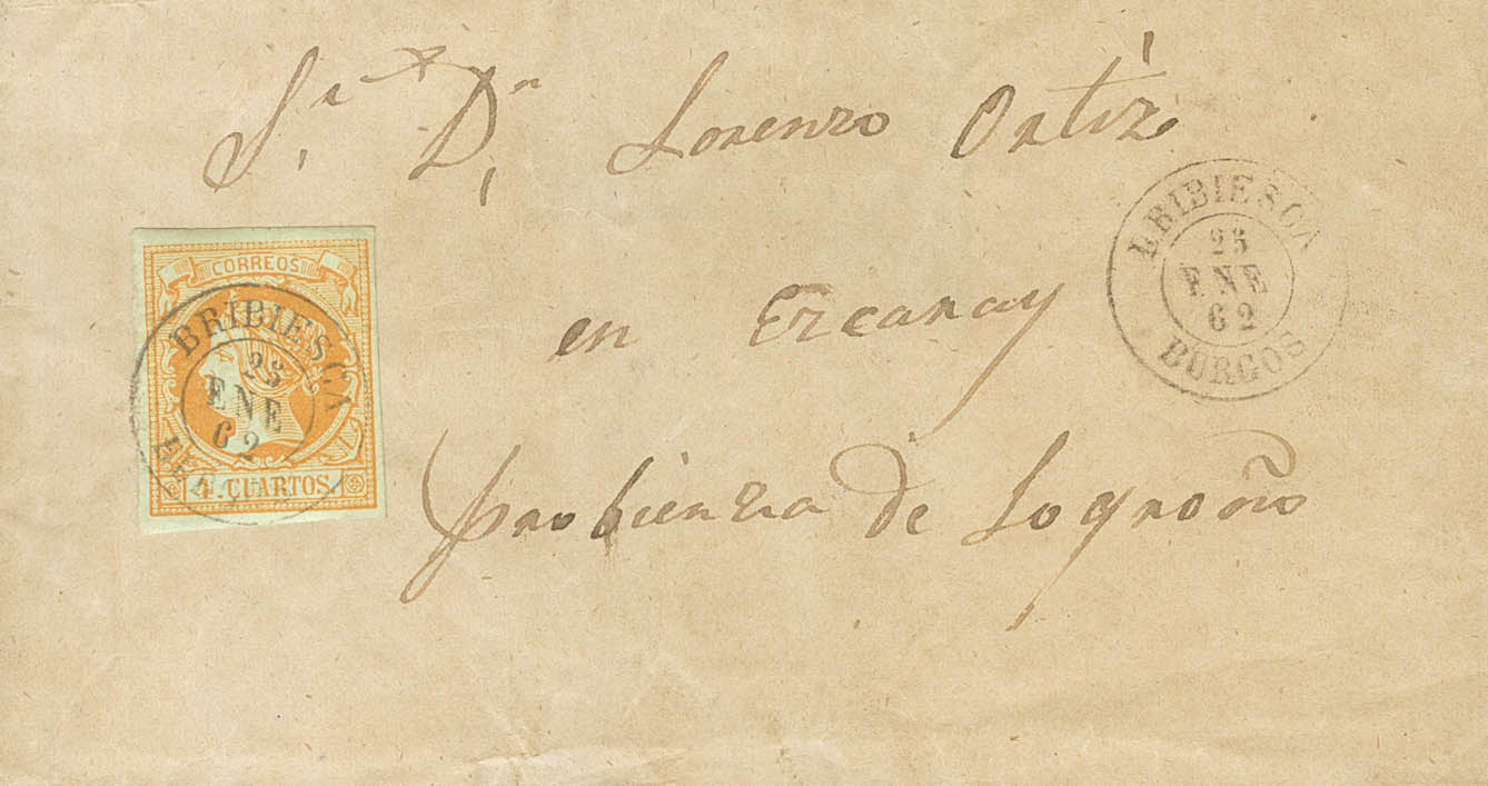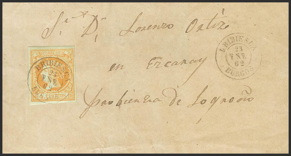 52. 1862. 4 cuartos naranja. BRIVIESCA a EZCARAY. Matasello BRIBIESCA / BURGOS. MAGNIFICA.