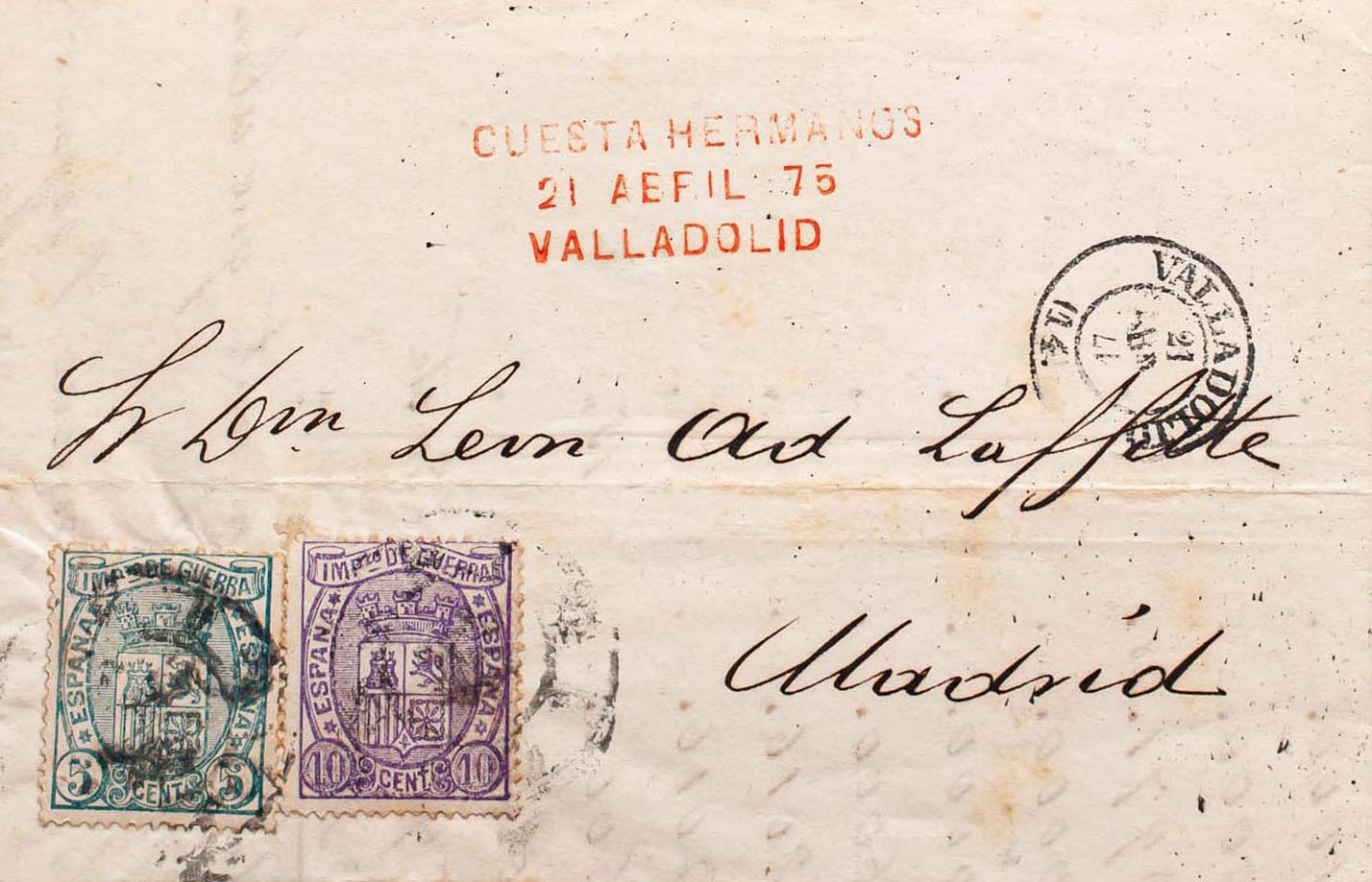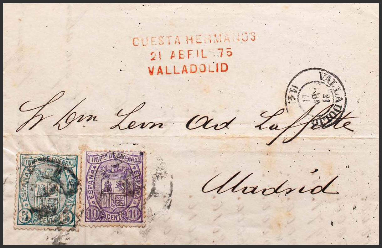 154, 155. 1875. 5 cts y 10 cts. VALLADOLID a MADRID. Matasello R.CARRETA Nº14. MAGNIFICA Y RARO FRANQUEO CON SELLOS DE IMPUESTO DE GUERRA, ADEMAS DEL USO TARDIO DE LA RUEDA DE CARRETA.