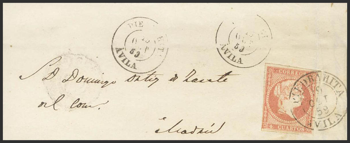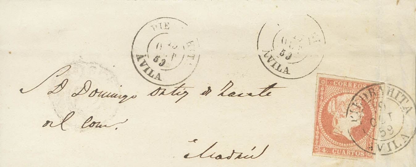 48. 1859. 4 cuartos rojo. PIEDRAHITA a MADRID. Matasello PIEDRAHITA / AVILA (Tipo I) y en el frente PIEDRAHITA / AVILA (Tipo II). MAGNIFICA E INUSUAL EL USO DE LOS DOS TIPOS DE FECHADOR.