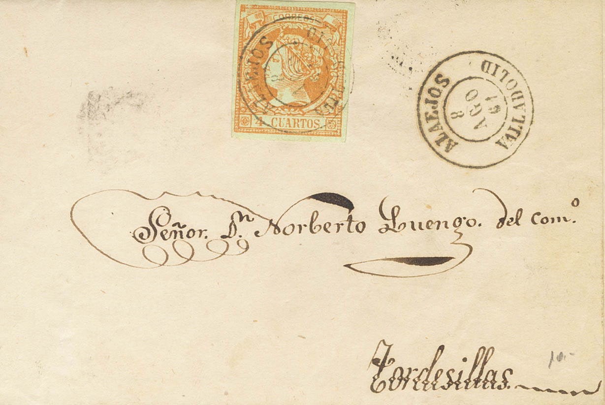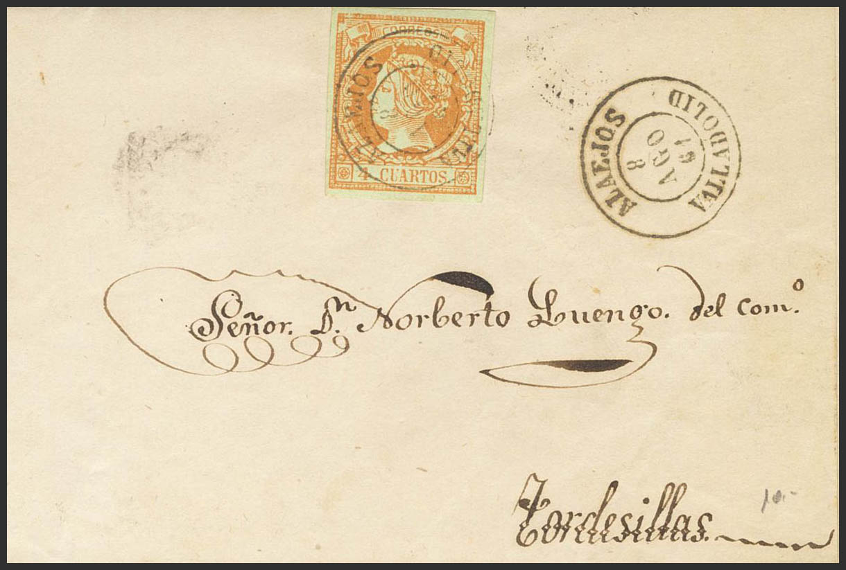 52. 1861. 4 cuartos naranja. ALAEJOS a TORDESILLAS. Matasello ALAEJOS / VALLADOLID. MAGNIFICA Y MUY RARA.