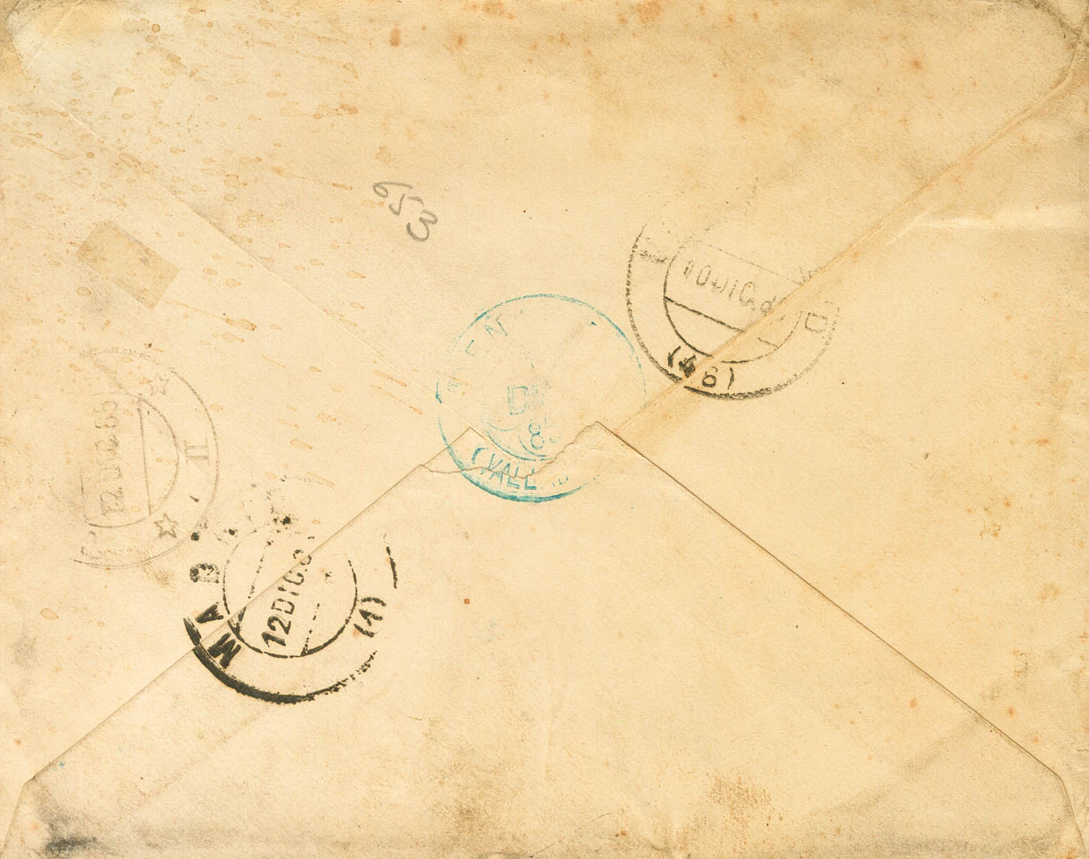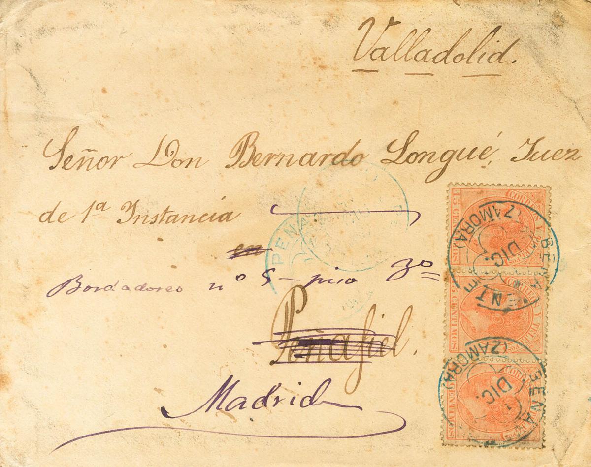 210(3). 1885. 15 cts naranja, tres sellos. BENAVENTE a PEÑAFIEL (VALLADOLID), reexpedida a MADRID. Matasello trébol BENAVENTE / (ZAMORA), en azul. MAGNIFICA E INUSUAL FRANQUEO DE TRIPLE PORTE.