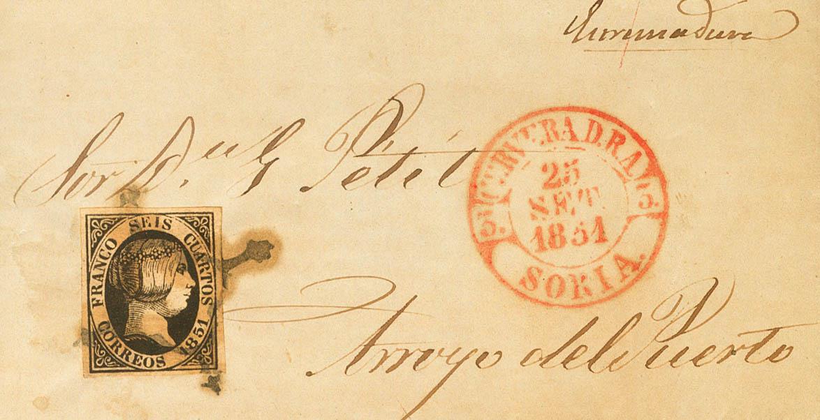 6. 1851. 6 cuartos negro. CERVERA DEL RIO ALHAMA a ARROYO DEL PUERCO (CACERES). En el frente baeza CERVERA D.R.A. / SORIA, en rojo. MAGNIFICA.