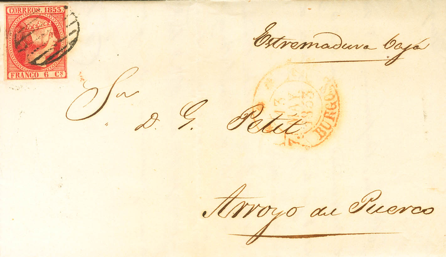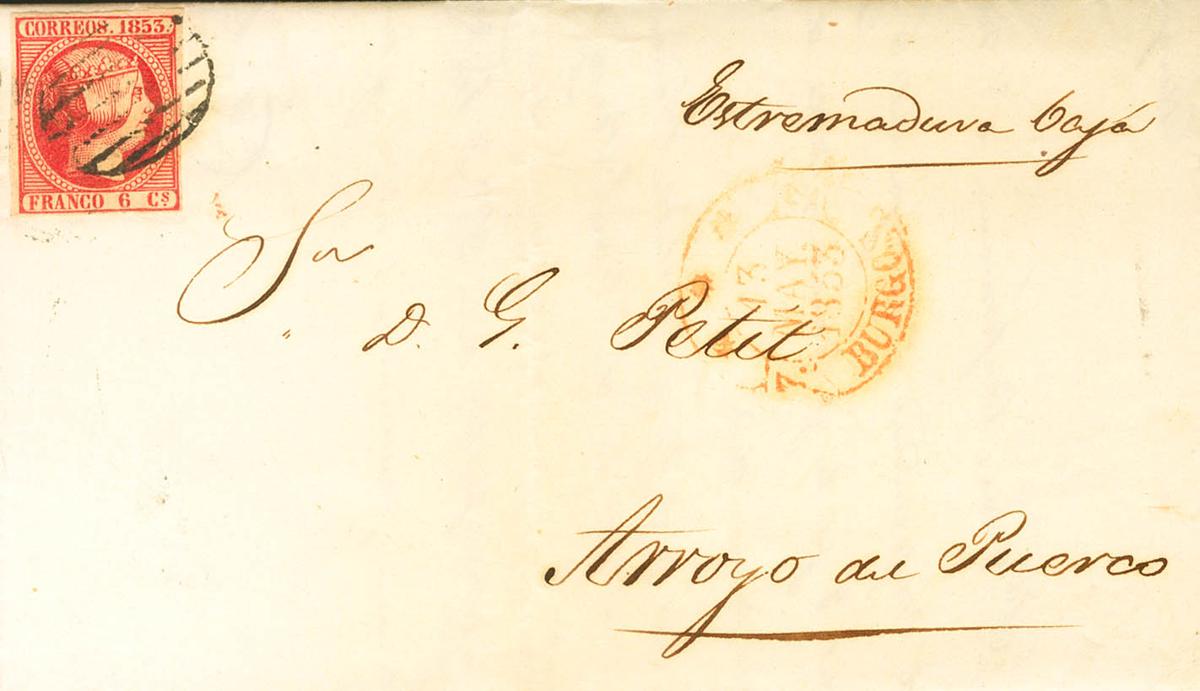 17. 1853. 6 cuartos carmÃn. BURGOS a ARROYO DEL PUERCO (CACERES). En el frente baeza *** / BURGOS, en rojo. MAGNIFICA.