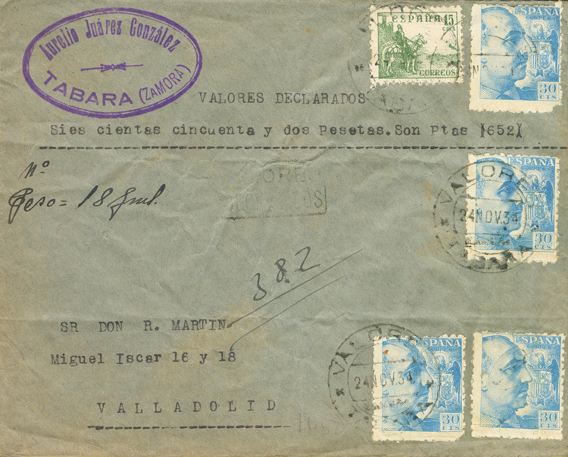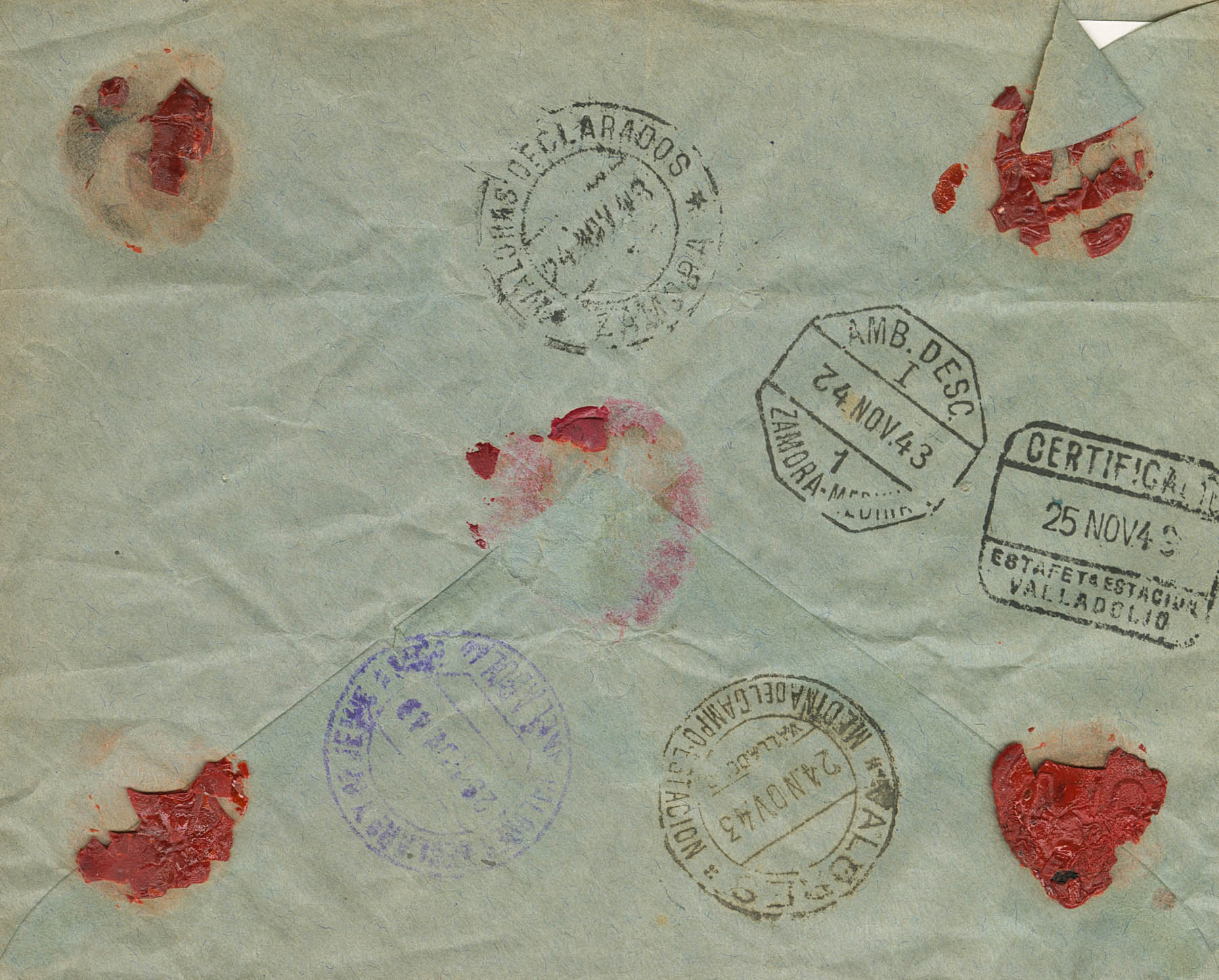 924(4), 918. 1943. 30 cts azul, cuatro sellos y 15 cts verde. Valores Declarados de TABARA (ZAMORA) a VALLADOLID. Al dorso ambulante AMB.DESC. / I / ZAMORA-MEDINA y tránsitos diversos. MAGNIFICA.