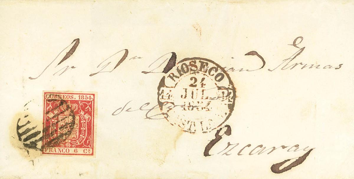 24. 1854. 6 cuartos carmÃn. MEDINA DE RIOSECO a EZCARAY. En el frente baeza RIOSECO / CAST.LA V. MAGNIFICA.