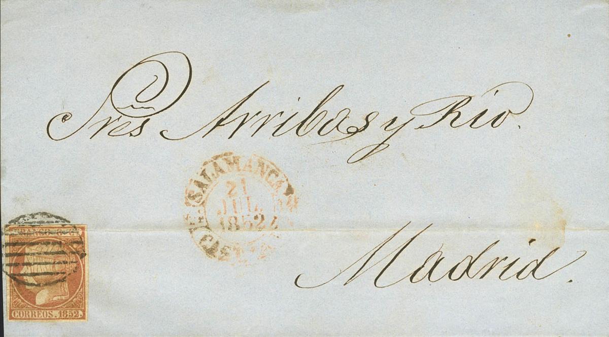 12. 1852. 6 cuartos rosa (pliegue de archivo). SALAMANCA a MADRID. En el frente baeza SALAMANCA / CAST.LA V. BONITA.