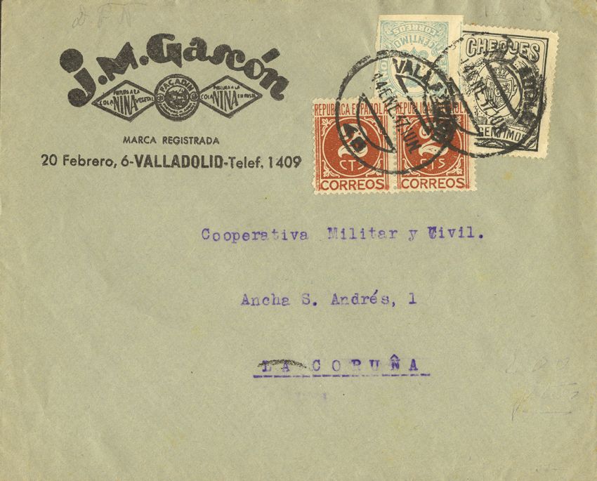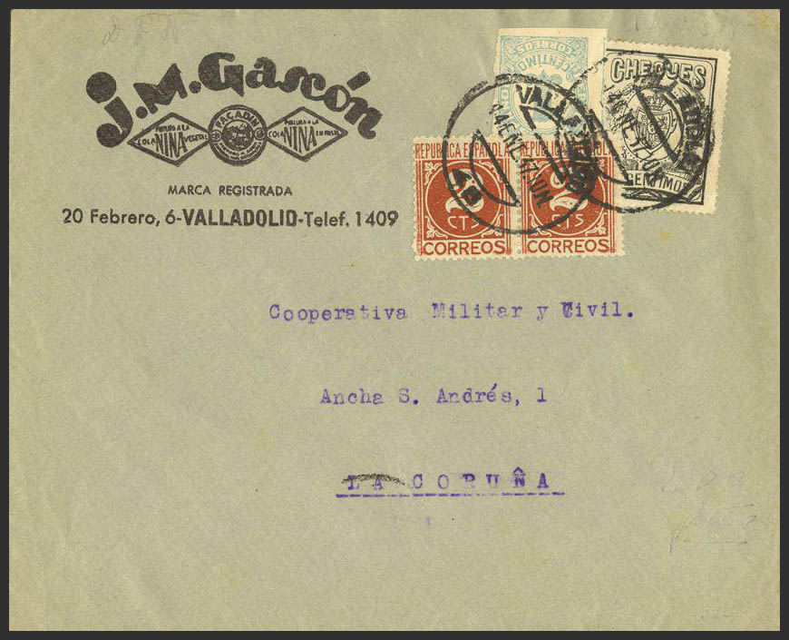 677, 731(2), Fis 14. 1937. 1 cts, 2 cts pareja, 30 cts CHEQUES. VALLADOLID a CORUÑA. MAGNIFICA.