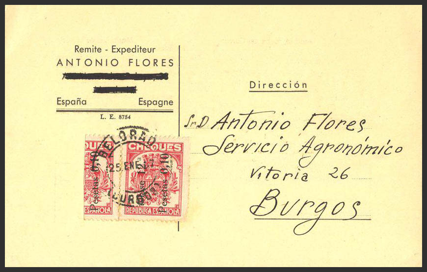 Fis 23. 1937. 0´10 pts carmÃn, un sello y un BISECTADO, CHEQUES. Tarjeta de BELORADO a BURGOS. MAGNIFICA.