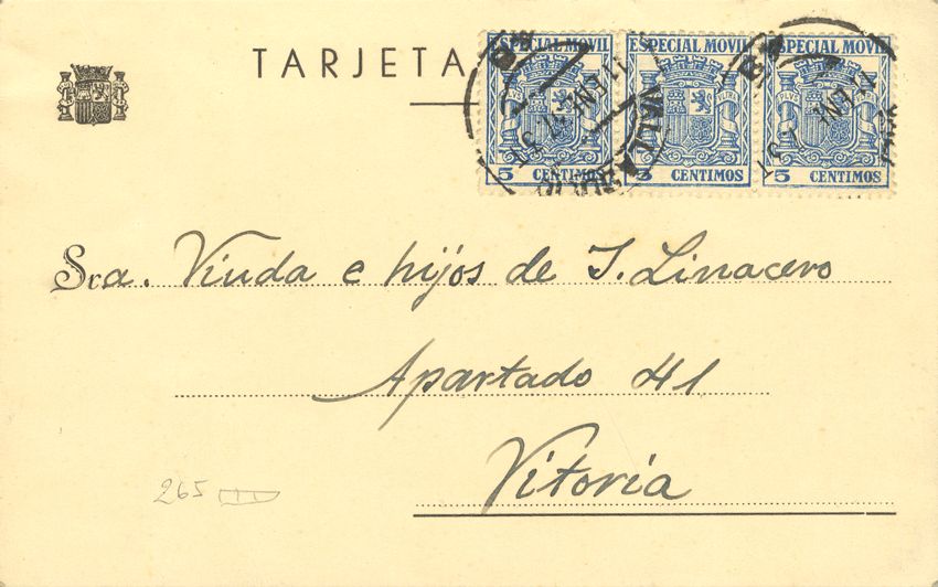 Fis 49(3). 1937. 5 cts azul , tira de tres MOVIL. Tarjeta postal de VALLADOLID a VITORIA. MAGNIFICA.