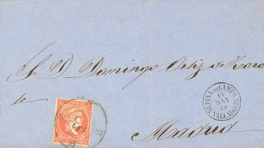 48. 1858. 4 cuartos rojo. MEDINA DEL CAMPO a MADRID. Matasello R. CARRETA Nº 55. MAGNIFICA.