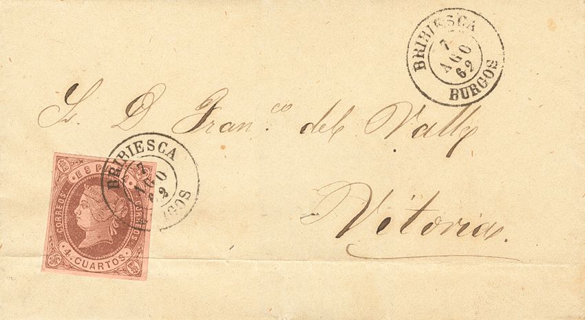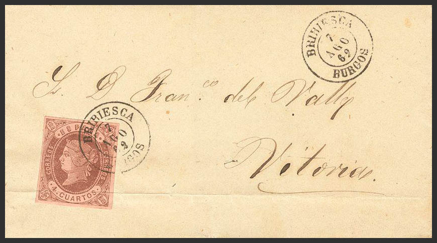58. 1862. 4 cuartos castaño. BRIBIESCA a VITORIA. Matasello BRIBIESCA / BURGOS. MAGNIFICA Y RARA.