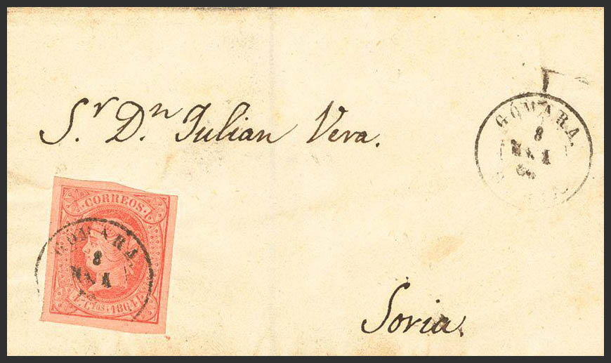 64. 1864. 4 cuartos rosa. GOMARA a SORIA. Matasello GOMARA / SORIA. MAGNIFICA Y RARA.