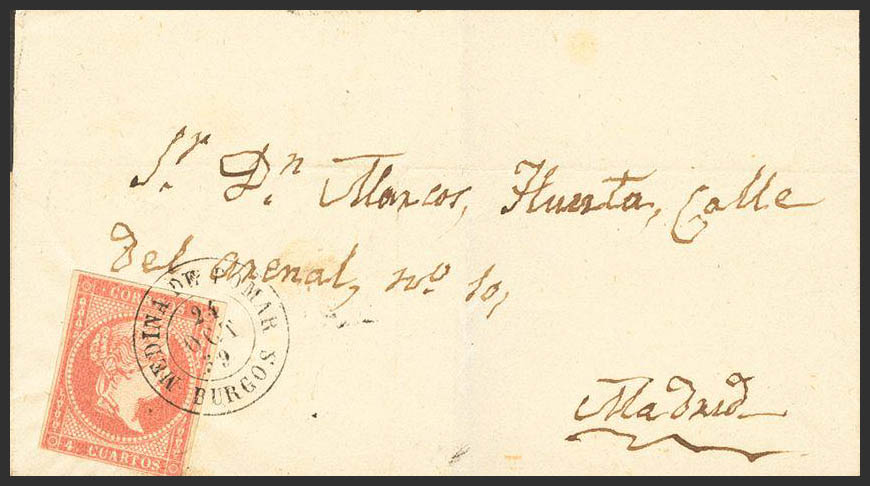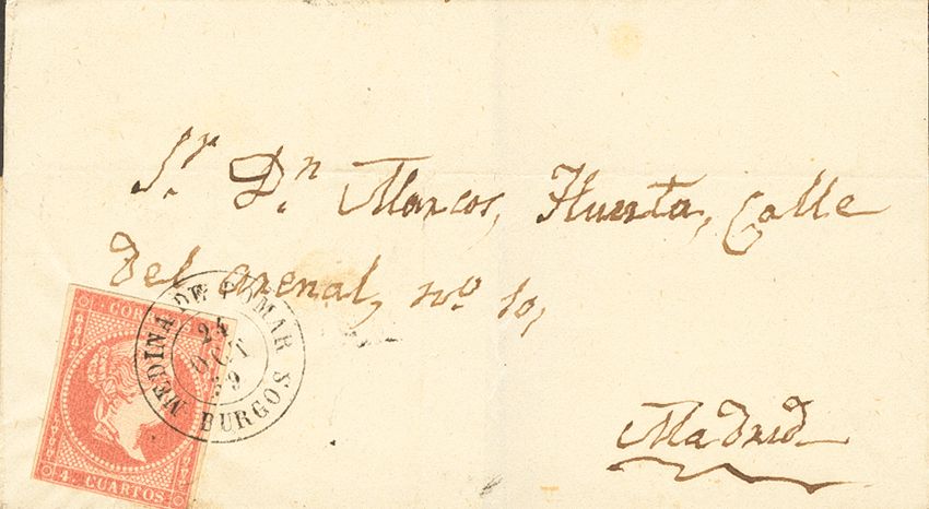 48. 1859. 4 cuartos rojo. MEDINA DE POMAR a MADRID. Matasello MEDINA DE POMAR / BURGOS. MAGNIFICA.