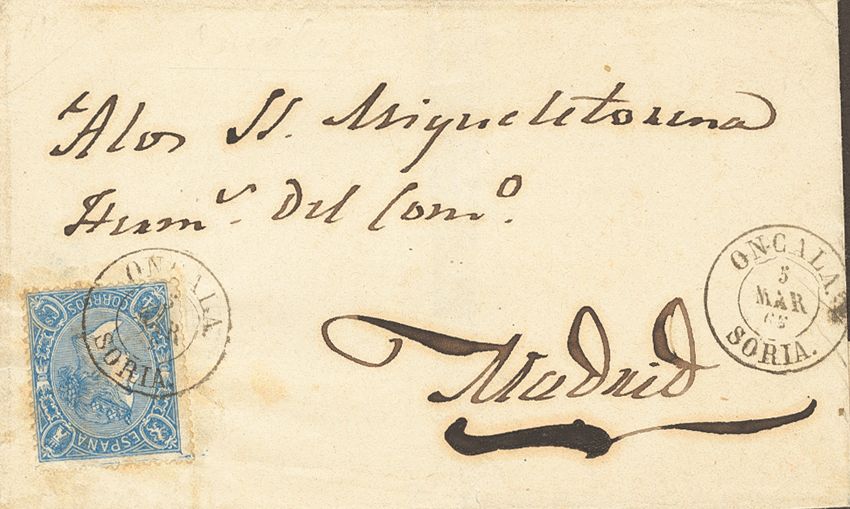 75. 1765. 4 cuartos azul. ONCALA a MADRID. Matasello ONCALA / SORIA. MAGNIFICA Y RARISIMO.