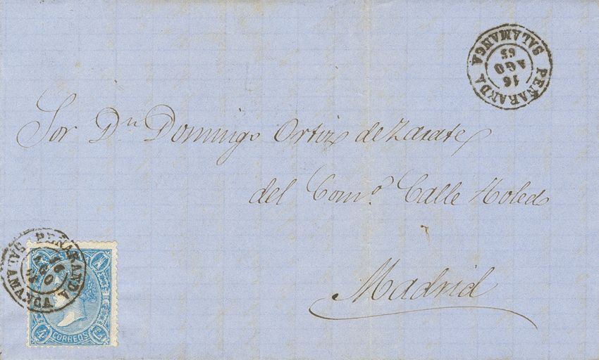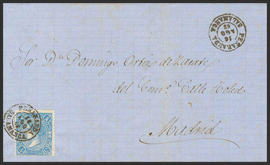 75. 1865. 4 cuartos azul. PEÑARANDA a MADRID. Matasello PEÑARANDA / SALAMANCA. MAGNIFICA.
