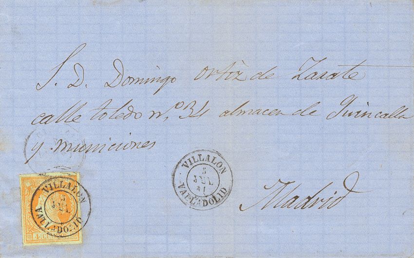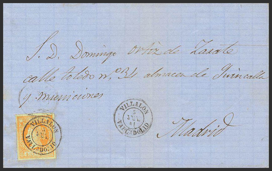 52. 1860. 4 cuartos amarillo. VILLALON a MADRID. Matasello VILLALON / VALLADOLID. MAGNIFICA Y MUY RARA.