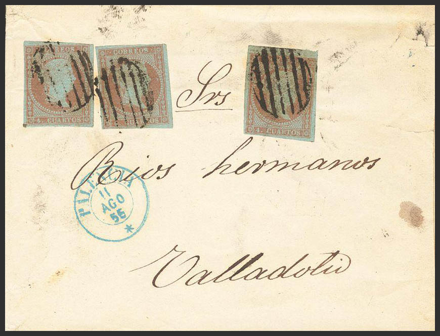40(3). 1856. 4 cuartos rojo, tres sellos. PALENCIA a VALLADOLID. Triple porte. MAGNIFICA.